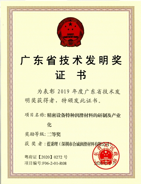 深圳市合誠潤滑材料有限公司“精密設備特種潤滑材料的研制及產業化”項目榮獲廣東省人民政府批準頒發的2019年度廣東省科學技術獎項——技術發明二等獎。